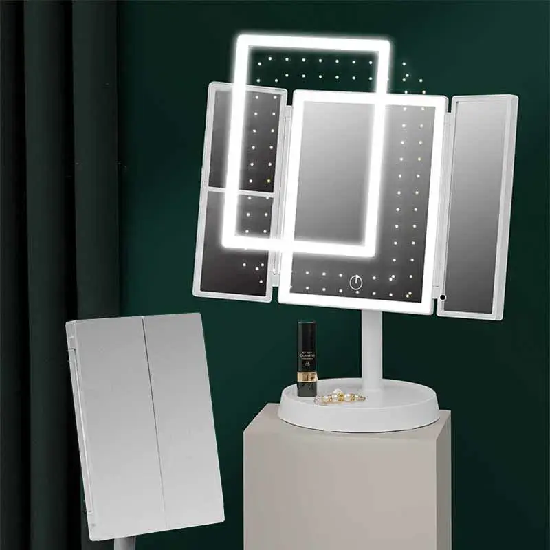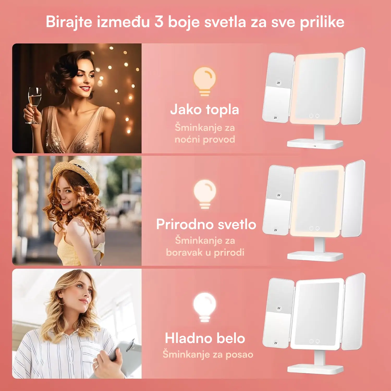 Moderan i kompaktan dizajn čini ovo ogledalo praktičnim za svakodnevnu upotrebu. Stabilno postolje i podesivi ugao omogućavaju lako prilagođavanje željenoj poziciji, dok mogućnost napajanja putem USB kabla ili baterija pruža potpunu fleksibilnost – kod kuće ili na putovanju.